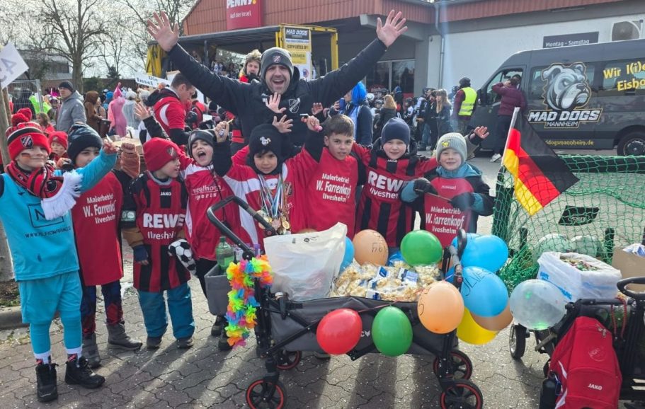Am Sonntag, den 15. Februar, hieß es für unsere Fußballabteilung: raus aus dem Training – rein ins bunte Ortsgeschehen. Mit rund 40 Teilnehmenden waren wir als Fußgruppe beim Ilvesheimer Fastnachtszug dabei: Kinder vor allem aus der F-, E- und D-Jugend, begleitet von Trainerteam und vielen Eltern. Und weil man uns auch zwischen Konfetti und Kamelle sofort erkennen sollte, liefen wir geschlossen in rot-schwarzen Trikots und weiterer Trainingskleidung in unseren Vereinsfarben mit.